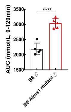 Figure 2. After ten weeks, studies on glucose tolerance were carried out on C57BL/6-Alms1-del mice. We measured blood glucose levels at 0, 15, 30, 60, 90, and 120 minutes. C57BL/6-Alms1-del mice have lower glucose tolerance, when compared to the control group. Data are presented as Mean±SD, with n=5. ****, p<0.0001; by unpaired two-tailed Student's t-test.