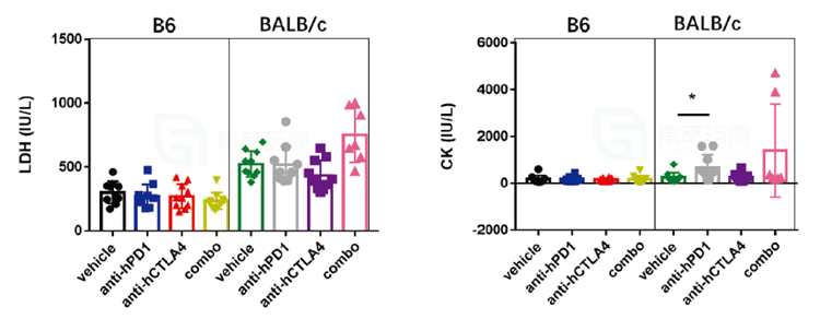 3、CTLA4的Yervoy药物在临床生化分析过程中,BALB/c背景小鼠的乳酸脱氢酶(LDH)和肌酸激酶(CK)明显高于B6背景小鼠,表明Yervoy药物对小鼠的心脏损伤在BALB/c背景鼠上更明显。