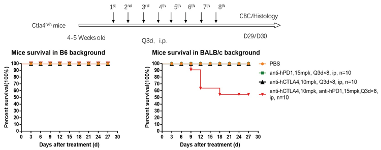 B6-hPD1/CTLA4背景小鼠模型对药物治疗具有耐受性;BALB/c-hPD1/hCTLA4背景的免疫检查点人源化小鼠模型能够重现临床中一些不良反应,是大分子、小分子的临床前药物毒性评价的理想模型。