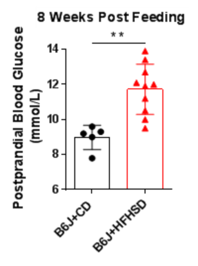 图3. C57BL/6J小鼠经45%高脂高糖饲料喂养8周后其餐后血糖较对照组明显增加。数据以Mean±SD展示,n=5~10。使用unpaired two-tailed Student's t-test方法进行统计学分析。**,P<0.01。