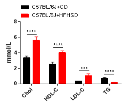 图4. C57BL/6J小鼠经45%高脂高糖饲料喂养8周后其胆固醇和甘油三酯水平显著升高。数据以Mean±SD展示。使用unpaired two-tailed Student's t-test方法进行统计学分析。***,p<0.001;****,p<0.0001。
