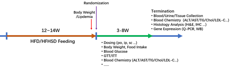 图1. DIO造模研究概览。HFD:60% 高脂饲料;HFHSD:45% 高脂高糖饲料。实验阶段:12-20周。