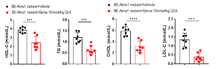 图10. Semaglutide可显著改善B6-Alms1突变小鼠的血脂异常。数据以Mean±SD展示。使用unpaired two-tailed Student's t-test方法进行统计学分析。***,p<0.001;****,p<0.0001。