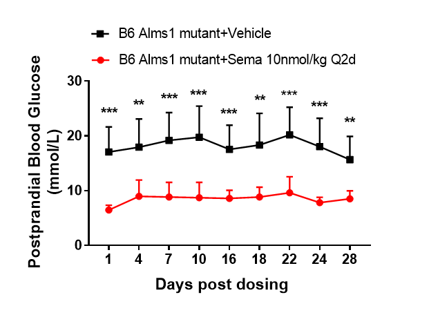 图9. Semaglutide干预显著降低了B6-Alms1突变小鼠餐后血糖水平。数据以Mean±SD展示。使用unpaired two-tailed Student's t-test方法进行统计学分析。**,p<0.01;***,p<0.001。