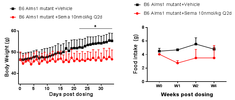 图1. C57BL/6-Alms1-del小鼠及对照小鼠体重曲线。数据以Mean±SEM展示。