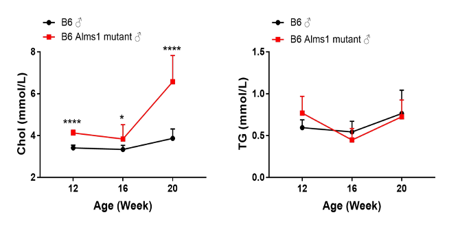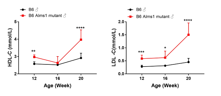 图4. 随着年龄增长,C57BL/6-Alms1-del小鼠高血脂表型更加严重。数据以Mean±SD展示,n=5。使用unpaired two-tailed Student's t-test方法进行统计学分析。**,p<0.05,**,p<0.01;***, p<0.001;****, p<0.0001。