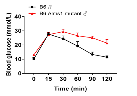 图2. 对照组和C57BL/6-Alms1-del小鼠10周龄时进行耐糖实验。在0、15、30、60、90和120min时测量血糖。结果显示C57BL/6-Alms1-del小鼠糖耐量降低。数据以Mean±SD展示,n=5。使用unpaired two-tailed Student's t-test方法进行统计学分析。****,p<0.000