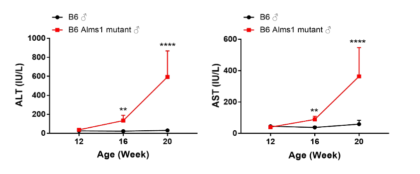 图5. C57BL/6-Alms1-del小鼠在16周时观察到肝损伤。数据以Mean±SD展示,n=5。使用unpaired two-tailed Student's t-test方法进行统计学分析。**,p<0.01;****, p<0.0001。