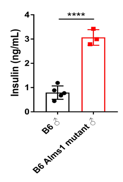 图3. C57BL/6-Alms1-del小鼠胰岛素水平相比对照组显著升高。数据以Mean±SD展示,n=5。使用unpaired two-tailed Student's t-test方法进行统计学分析。****,p<0.0001。