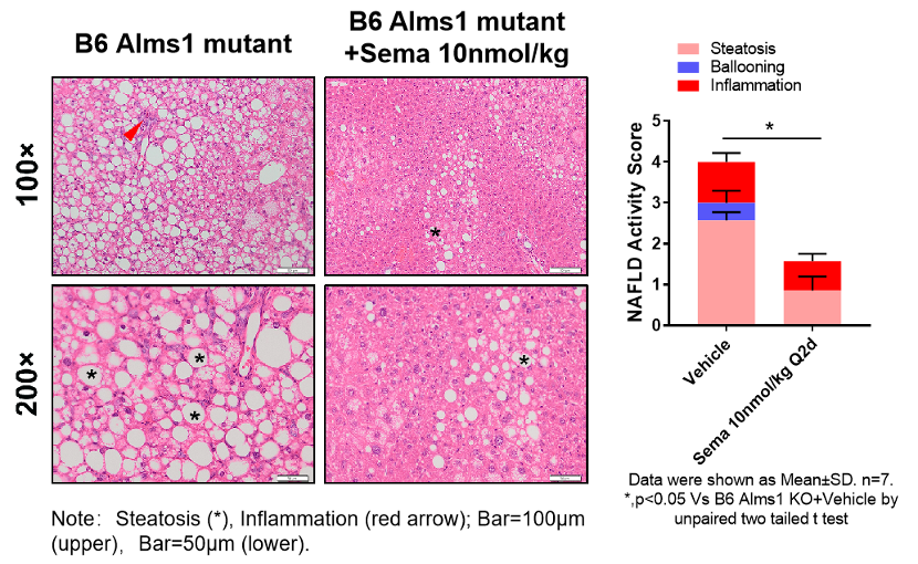 图12. Semaglutide显著改善了B6-Alms1突变小鼠的肝脂肪变性、炎症和细胞空泡病变。数据以Mean±SD展示。使用unpaired two-tailed Student's t-test方法进行统计学分析。*,p<0.05。