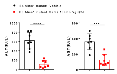 图11. Semaglutide可显著改善B6-Alms1突变小鼠肝酶水平。数据以Mean±SD展示。使用unpaired two-tailed Student's t-test方法进行统计学分析。***,p<0.001;****,p<0.0001。