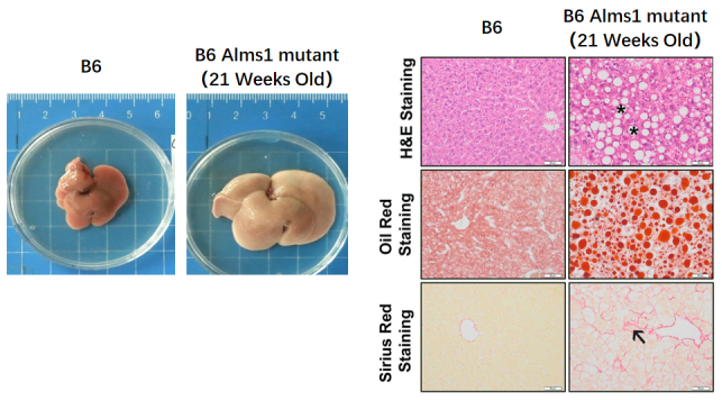 图6. C57BL/6-Alms1-del小鼠在21周时观察到严重的脂肪肝表型,包括脂肪变性、炎症、脂质沉积和纤维化。