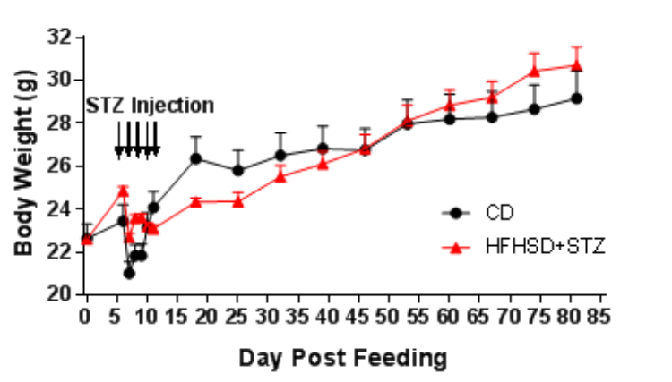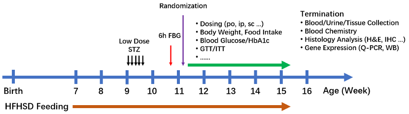 图1. HFHSD配合STZ诱导模型研究概览。实验阶段:8-12周,用鼠量:10-12只/组,5-8组。