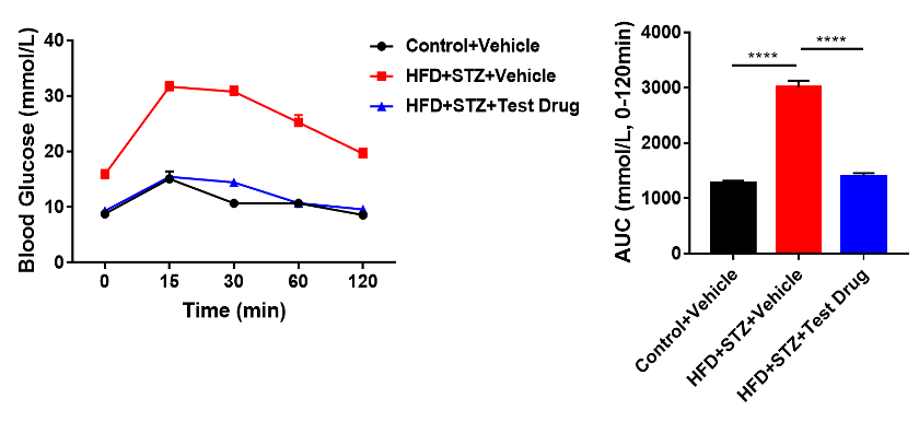图4. 测试药物可显著改善模型组小鼠的糖耐量。数据以Mean±SEM展示,n=5~10。