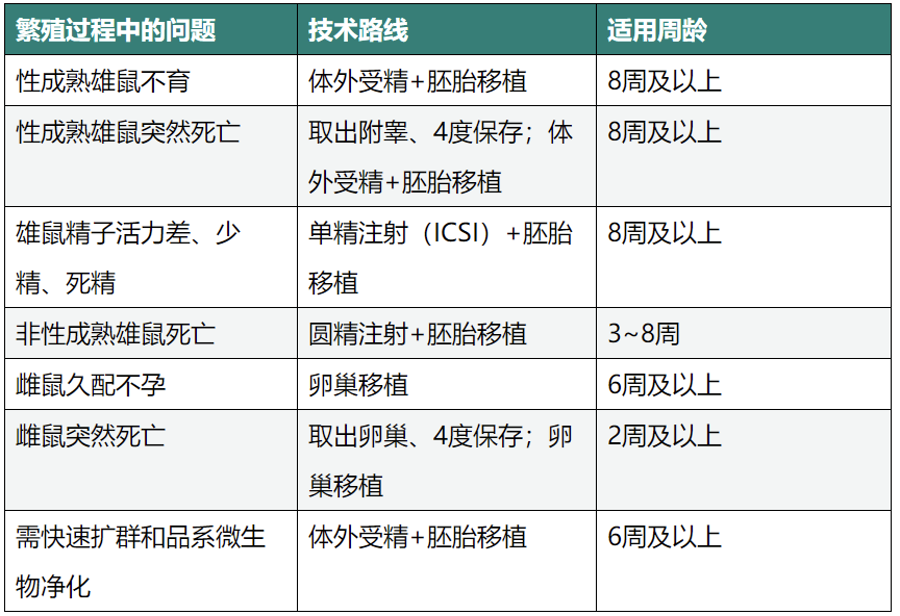 凭借辅助生殖技术手段,可以挽救因小鼠年龄较大、微生物感染、生殖器官畸形或发育异常、肥胖导致交配困难等因素引起的不孕不育品系。常用的辅助生殖技术包括体外受精、小鼠胞浆内单精子注射、小鼠圆形精子注射、卵巢移植等。